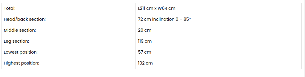 - HalloTronic® System enables electric high/low height adjustment from 57 to 102 cm with capacity up to 200 kg