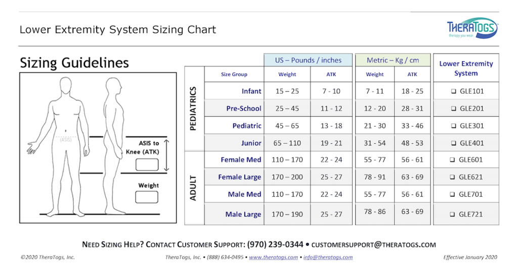 The TheraTogs Lower Extremity System is specifically crafted to support rehabilitation activities that target alignment and functional irregularities in the knee joints, developing femurs, and hip joints. It is intended for use by independently walking children and ambulatory adults who do not have issues related to hip or trunk stability.