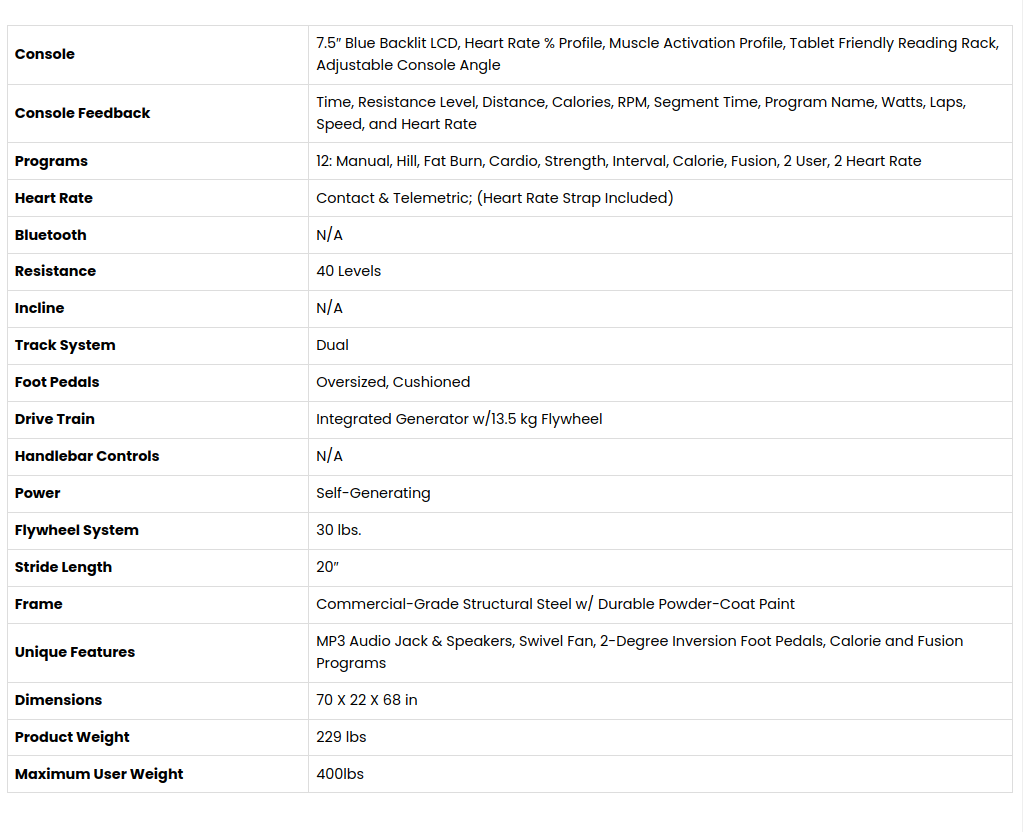 The Spirit Fitness XE795 features a natural 20"" stride length and narrow pedal spacing to ensure an ideal stride motion, while the oversized/cushioned foot pedals and cushioned ergonomic hand grips ensure comfort at the touch points.