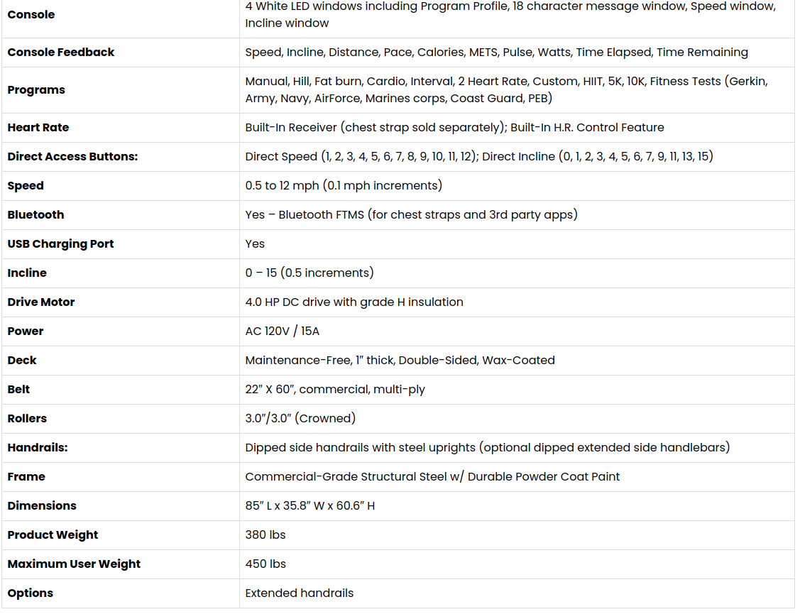 The CT800 commercial treadmill has a reputation for reliability and value that meets your space and budget needs. Weighing in at 380 lb and backed by an impressive warranty, this machine is truly heavy-duty and packs a load of premium features that keep clients happy. The top control panel boasts a simple and intuitive design with direct speed and incline buttons, multiple storage options for water bottles, phones, and other accessories, as well as a built-in fan that helps keep users cool. The ergonomically positioned hand pulse sensors let users easily monitor vital stats, while a variety of built-in programs allow nearly endless workout customization to suit a wide range of fitness levels.