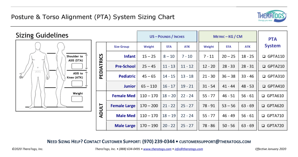 The TheraTogs Posture & Torso Alignment (PTA) System is the preferred starting point for seeing improvements in upper body alignment and posture by providing carryover of rehabilitation activities that take advantage of our neuromotor system’s ability to learn and adapt to corrected alignment.